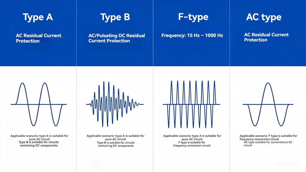 Dân dụng/Người tiêu dùng: Ưu tiên 2P/1P+N, loại AC hoặc loại A, loại tức thời, RCBO